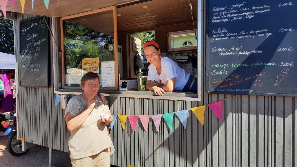 Die Fläche war bei bestem Sommerwetter gut mit Verkaufsständen gefüllt, das Interesse der Besucher war groß. Es wurde gehandelt, gekauft und geplauscht. Für die Abkühlung zwischendurch sorgte der Heimatimbiss mit seinem mobilen Verkaufsstand. Dort gab es Eis und Kaffeespezialitäten.